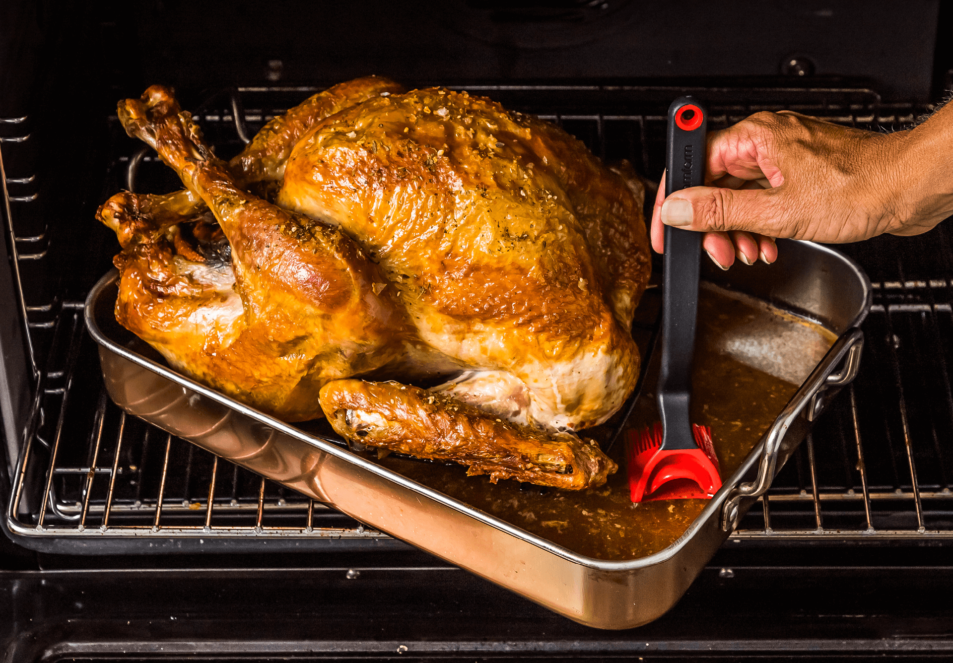Brizzle’s weighted handle design keeps the baster head up, germ-free, and drip-free when you put it down between applications.