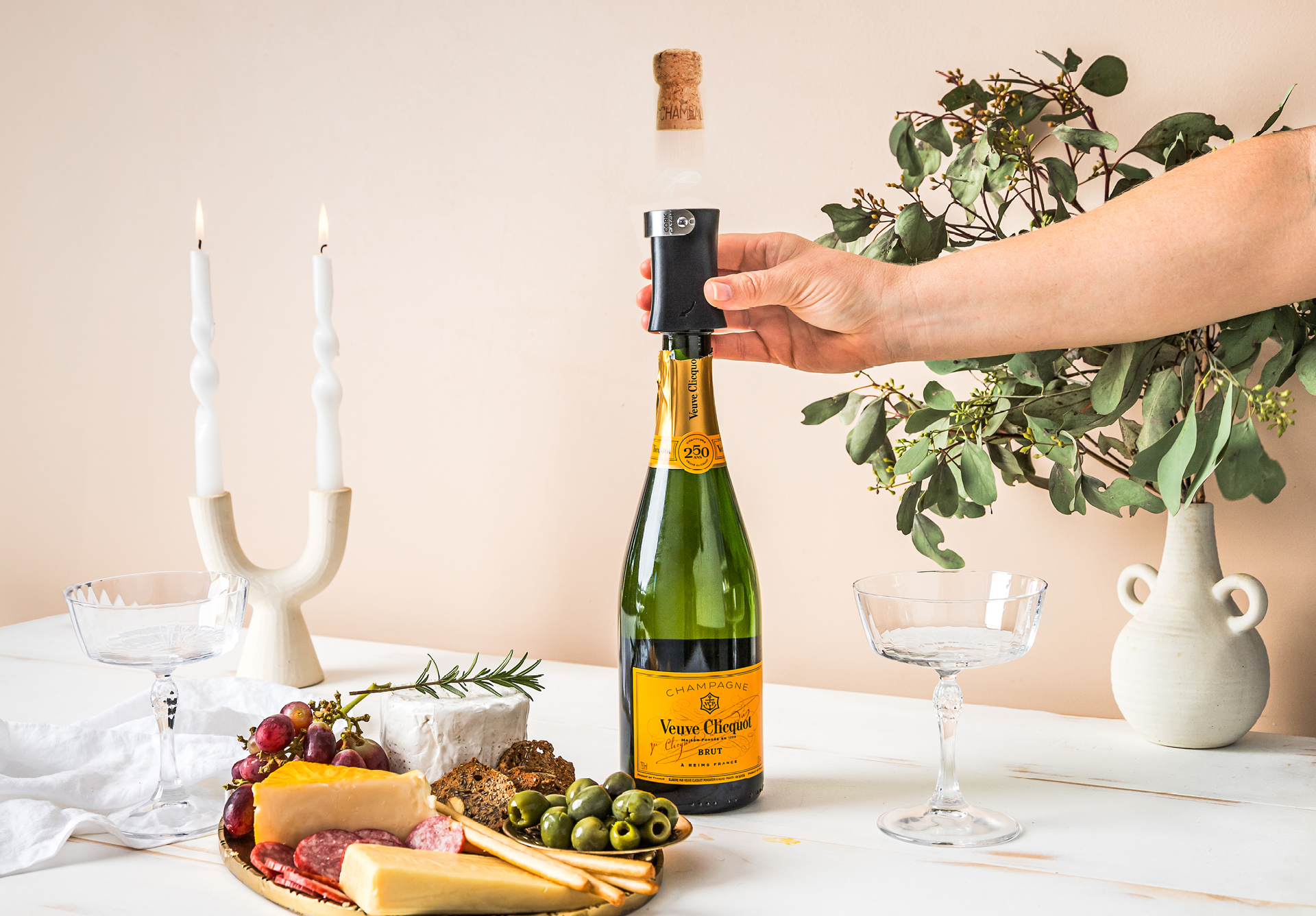 Dreamfarm Champop is a champagne cork remover that safely pops and catches the cork, or lets it fly.