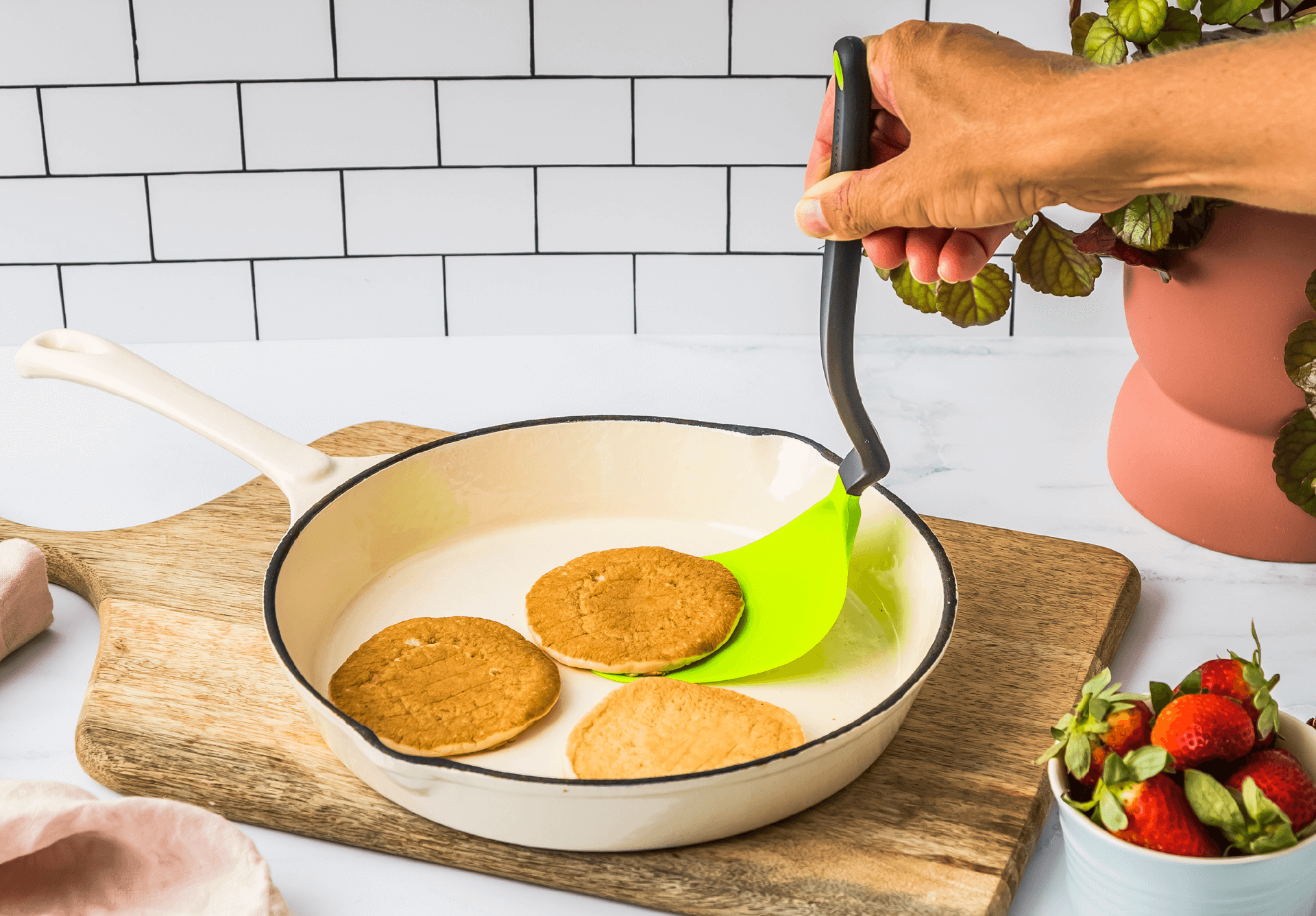 Chopula’s super flexible head slides easily under food for a clean lift and flip that keeps even the most delicate food in one piece.