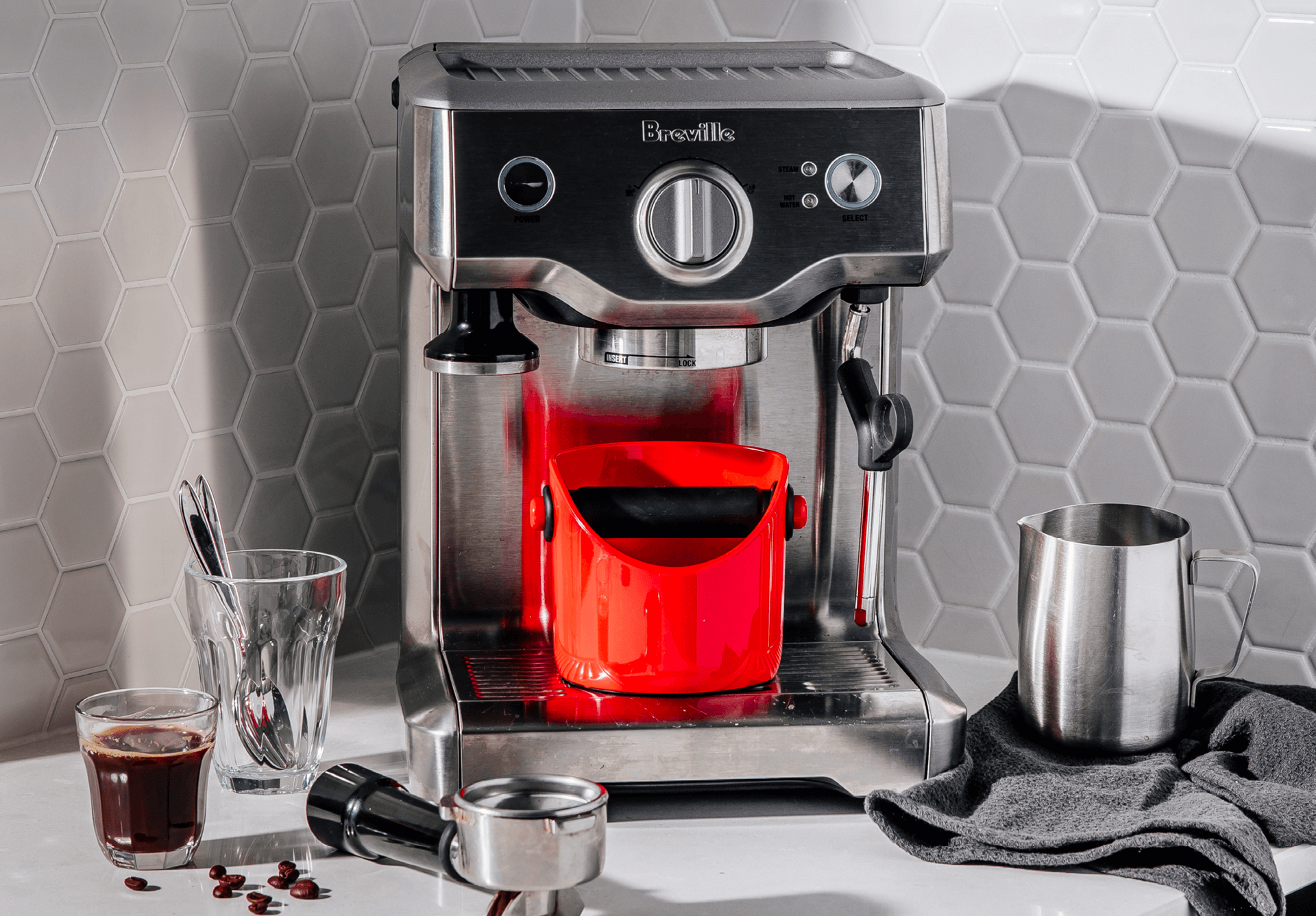 Specifically designed to be stored on the espresso machine's drip tray (under the group head), Grindenstein's unique height reduces clutter on the kitchen bench top and fits easily in the top rack of the dishwasher.