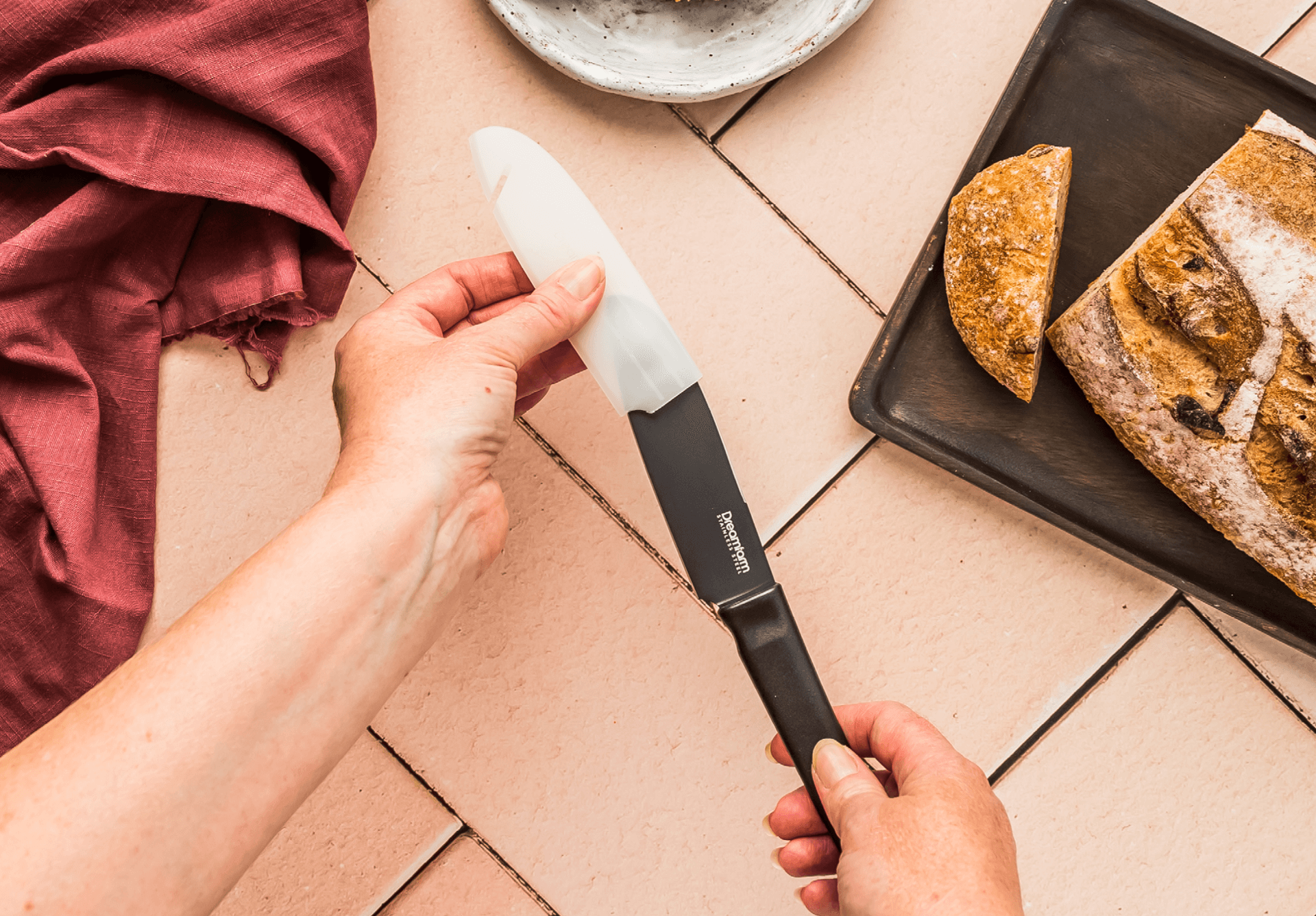 Wide-mouth sheath creates a built-in plastic wrap cutter, protects the blade in your kitchen drawers, and lets you safely take Kneed on picnics.