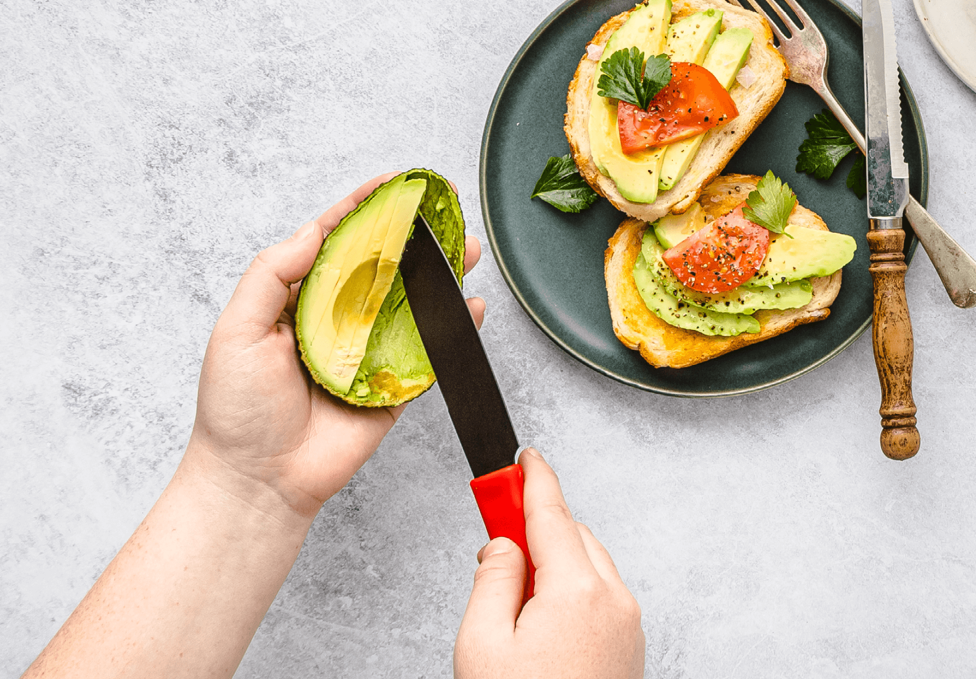 Kneed is the perfect avocado tool. Cut your avocado open and remove the pit with the sharp side of Kneed, flip it over and use the spreading side to slice, scoop, and spread.