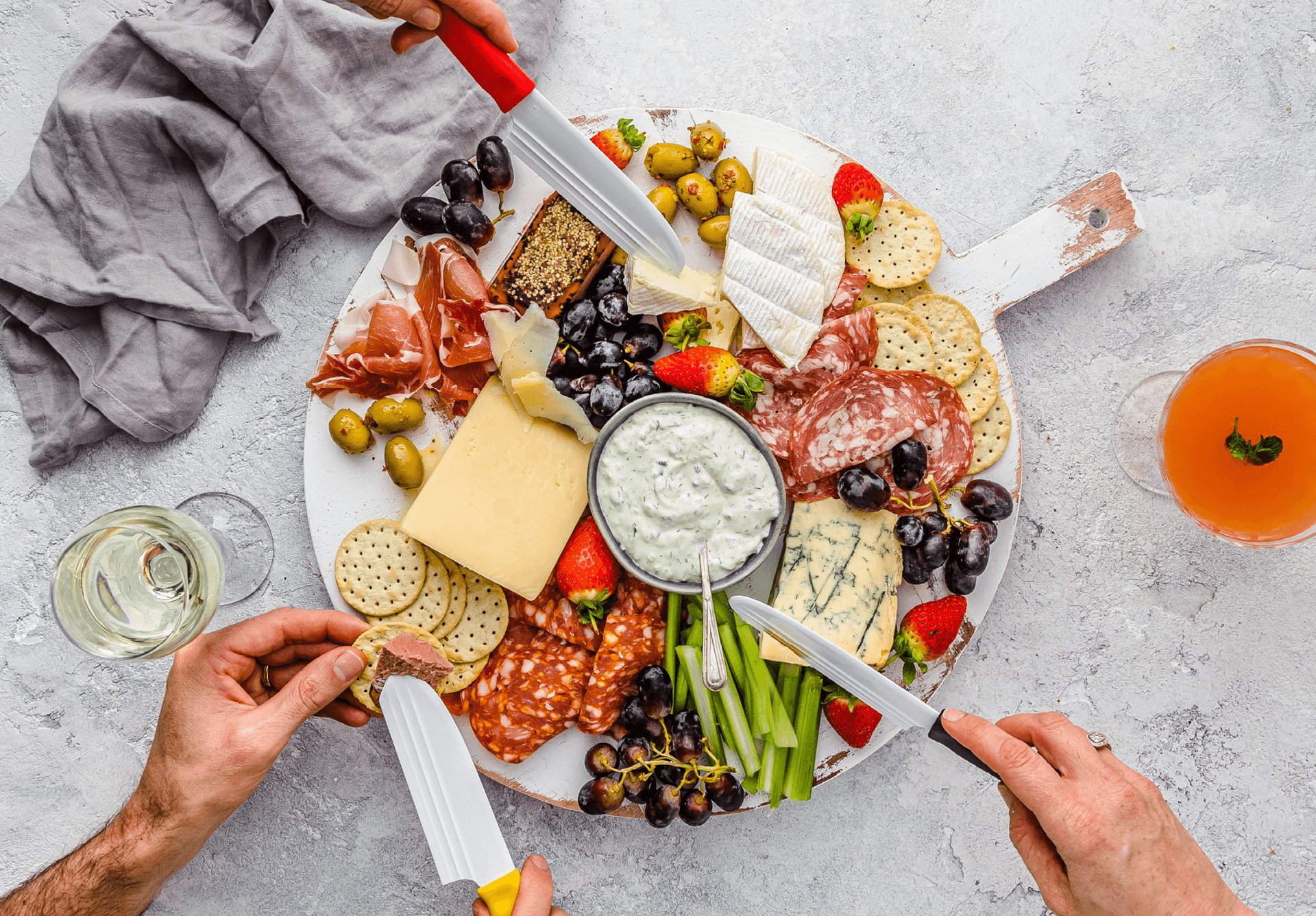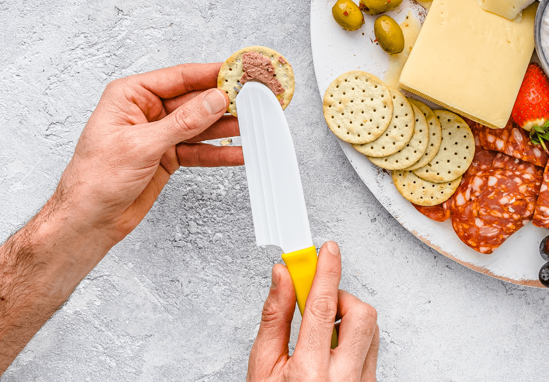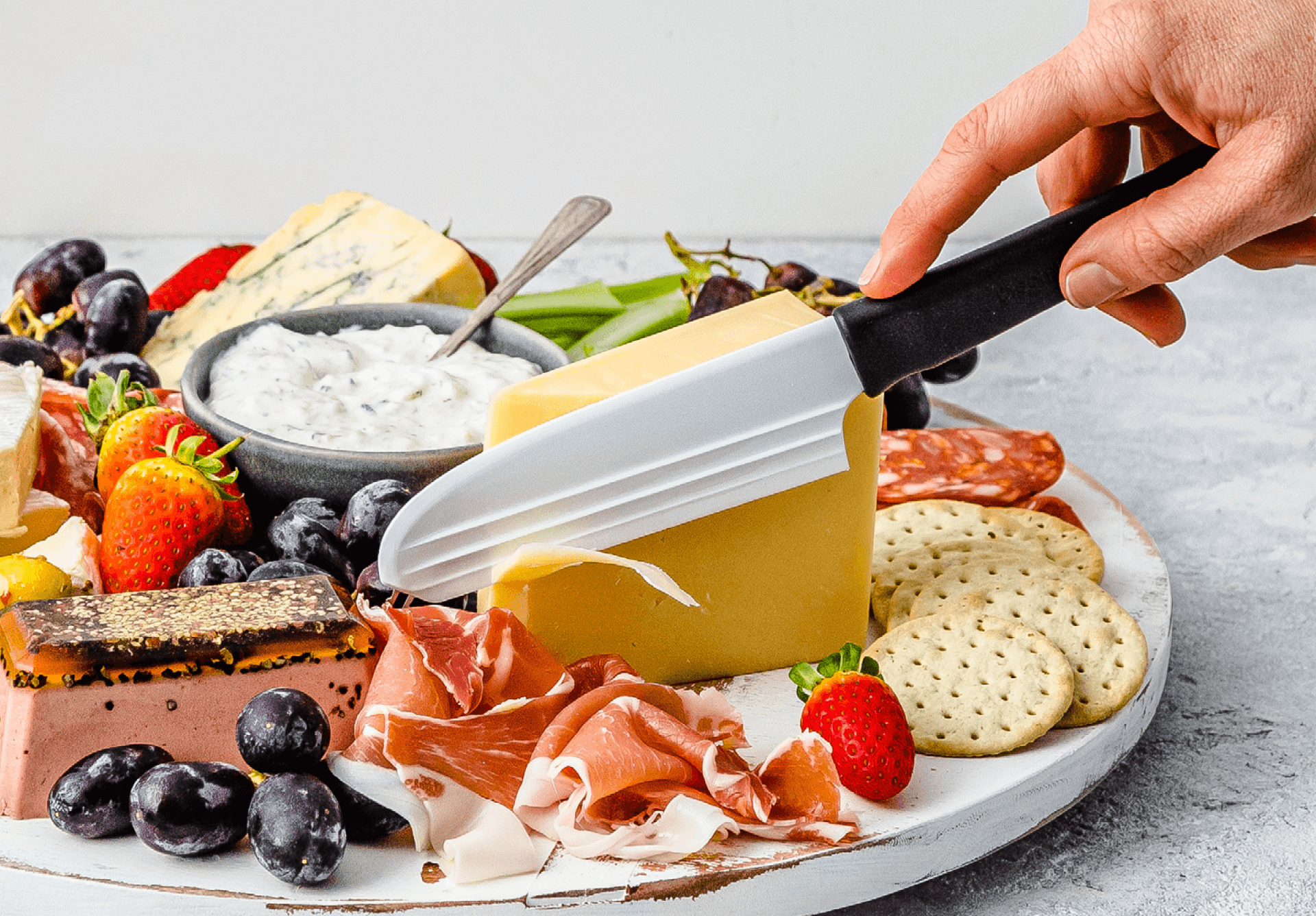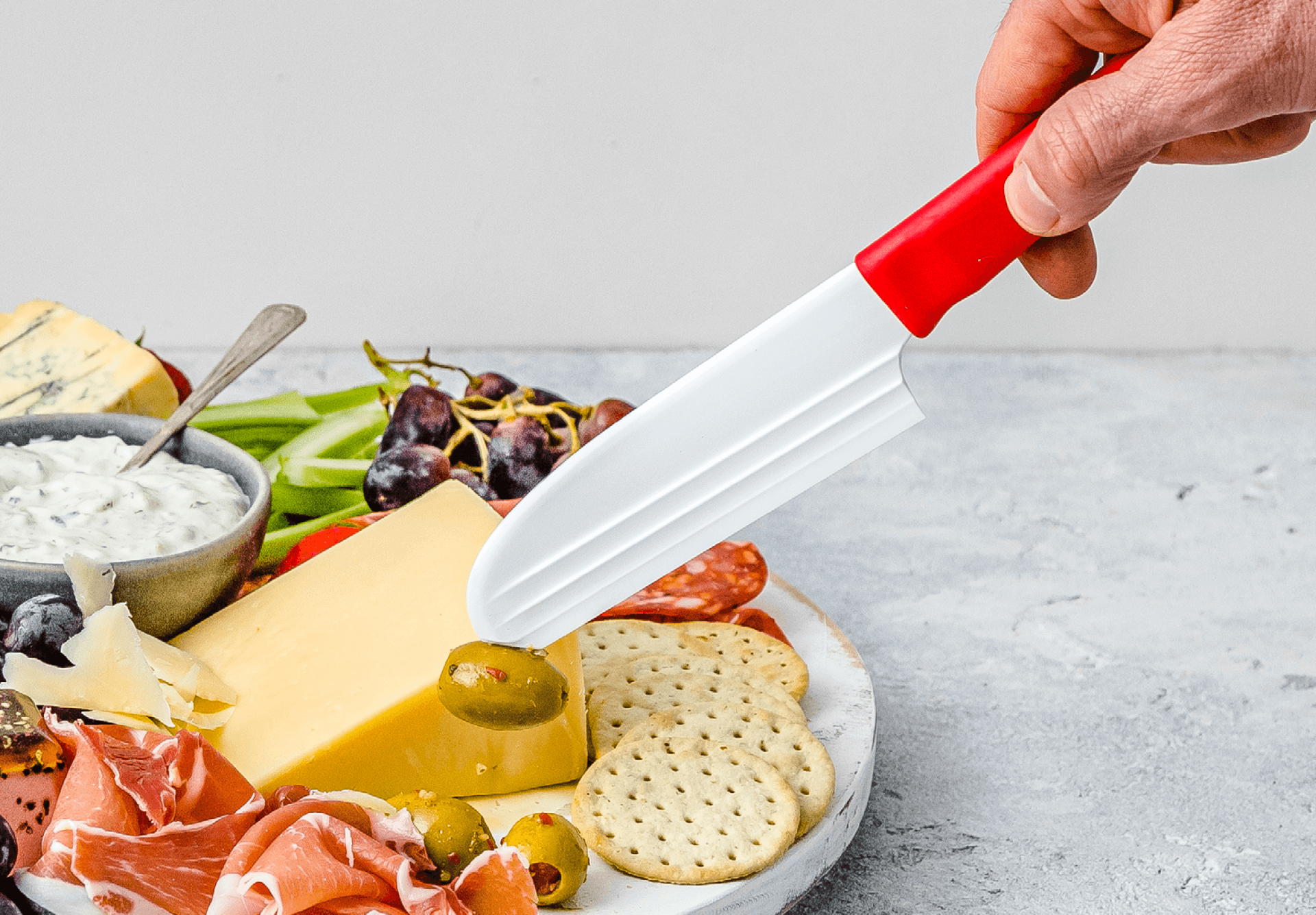 The forks at the end of the Knibble Lite blade help you pick up and serve meats, cheeses, olives, sun dried tomatoes, or any other nibbles you have on your cheese platter.