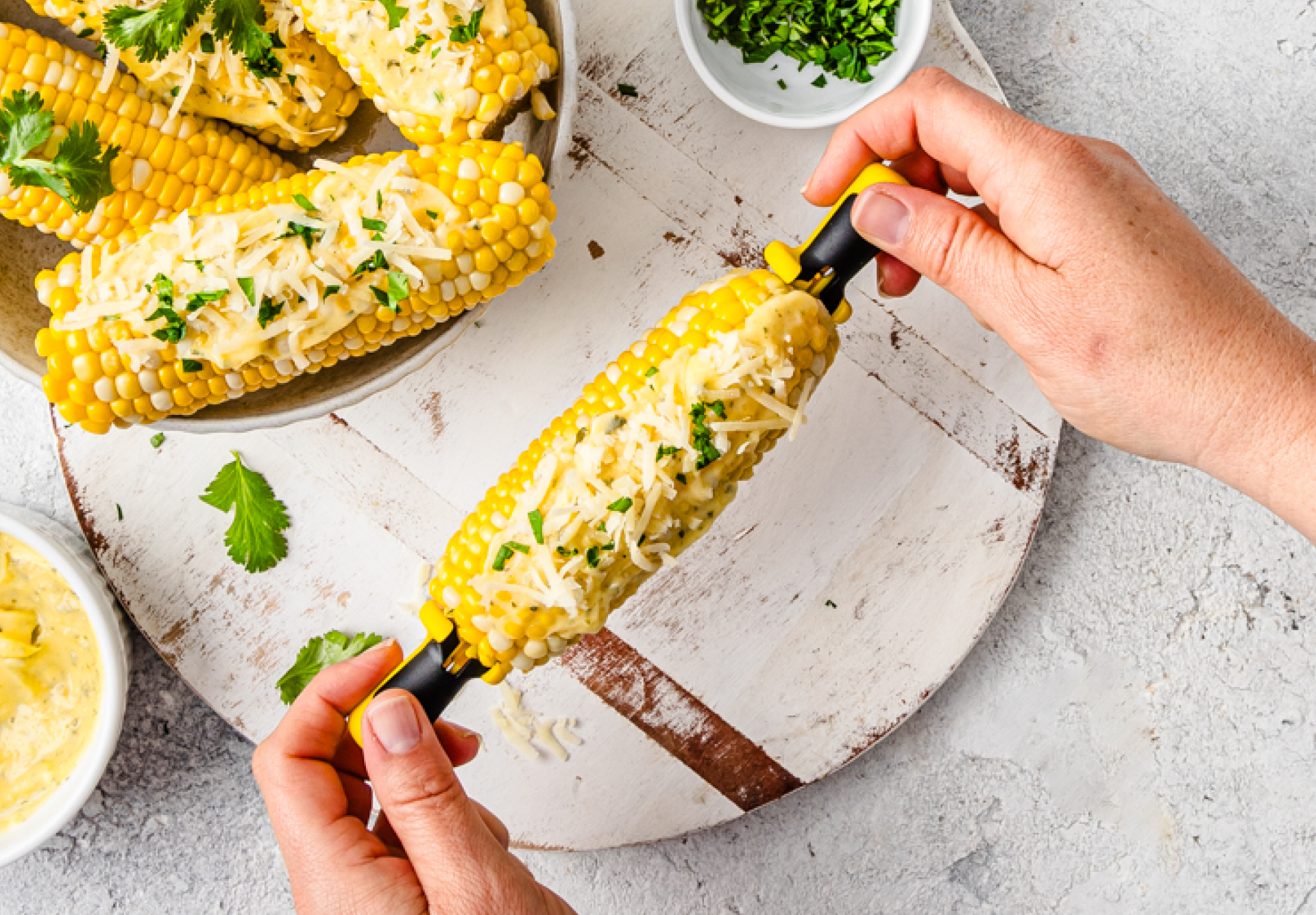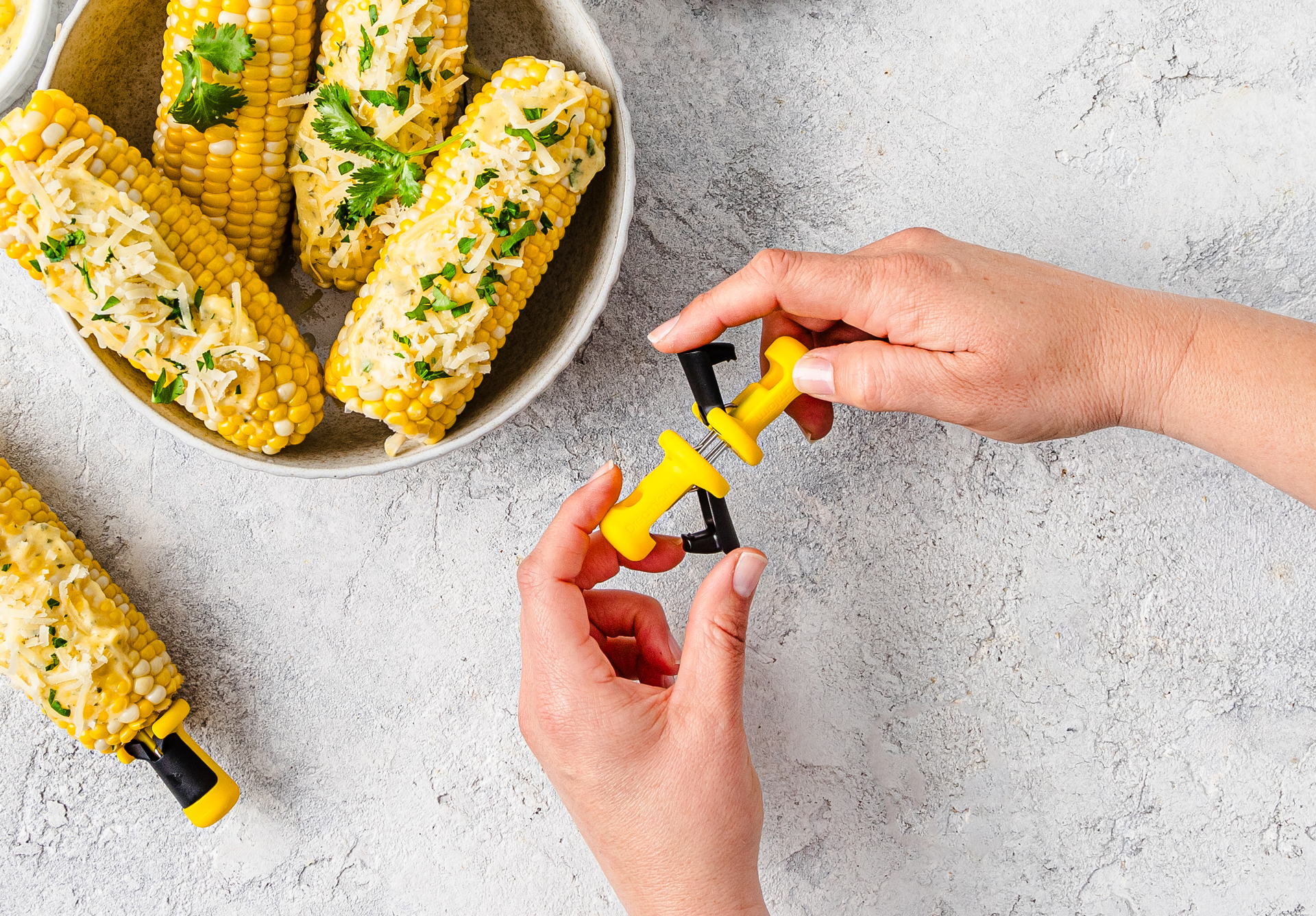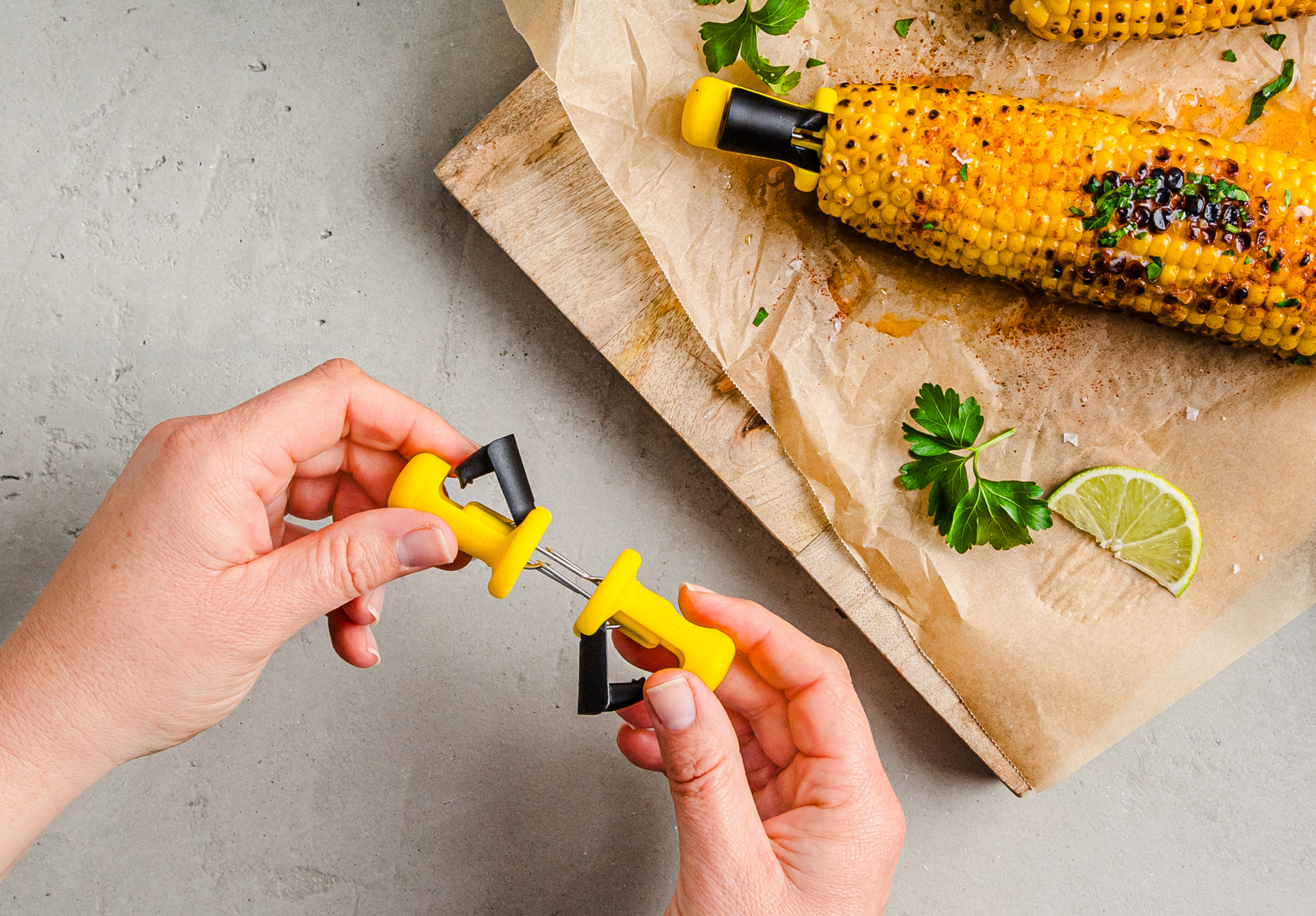 Lockorns are corn holders that securely anchor into corn cobs and lock together for safe storage.