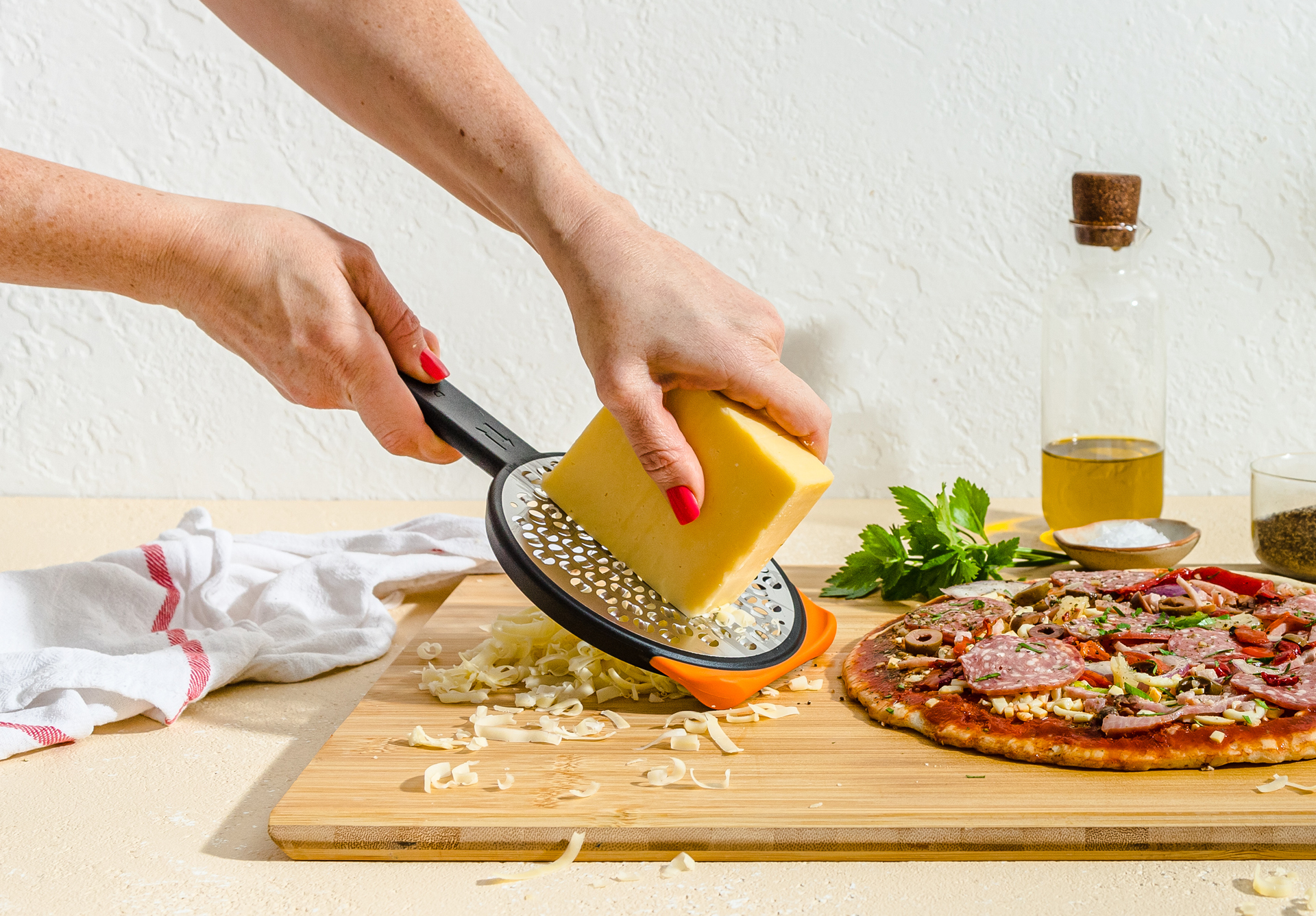 Top side blades grate in both an up and down motion for efficient grating, and features an extra-wide plane for large foods like cheese.