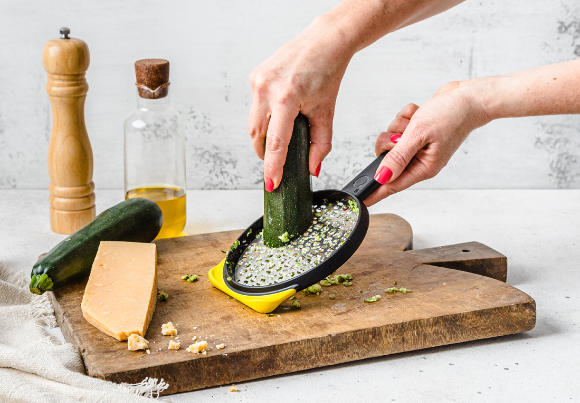 Ograte is a two-sided speed grater that continuously works in a circular motion on one side, and an up and down motion on the other.