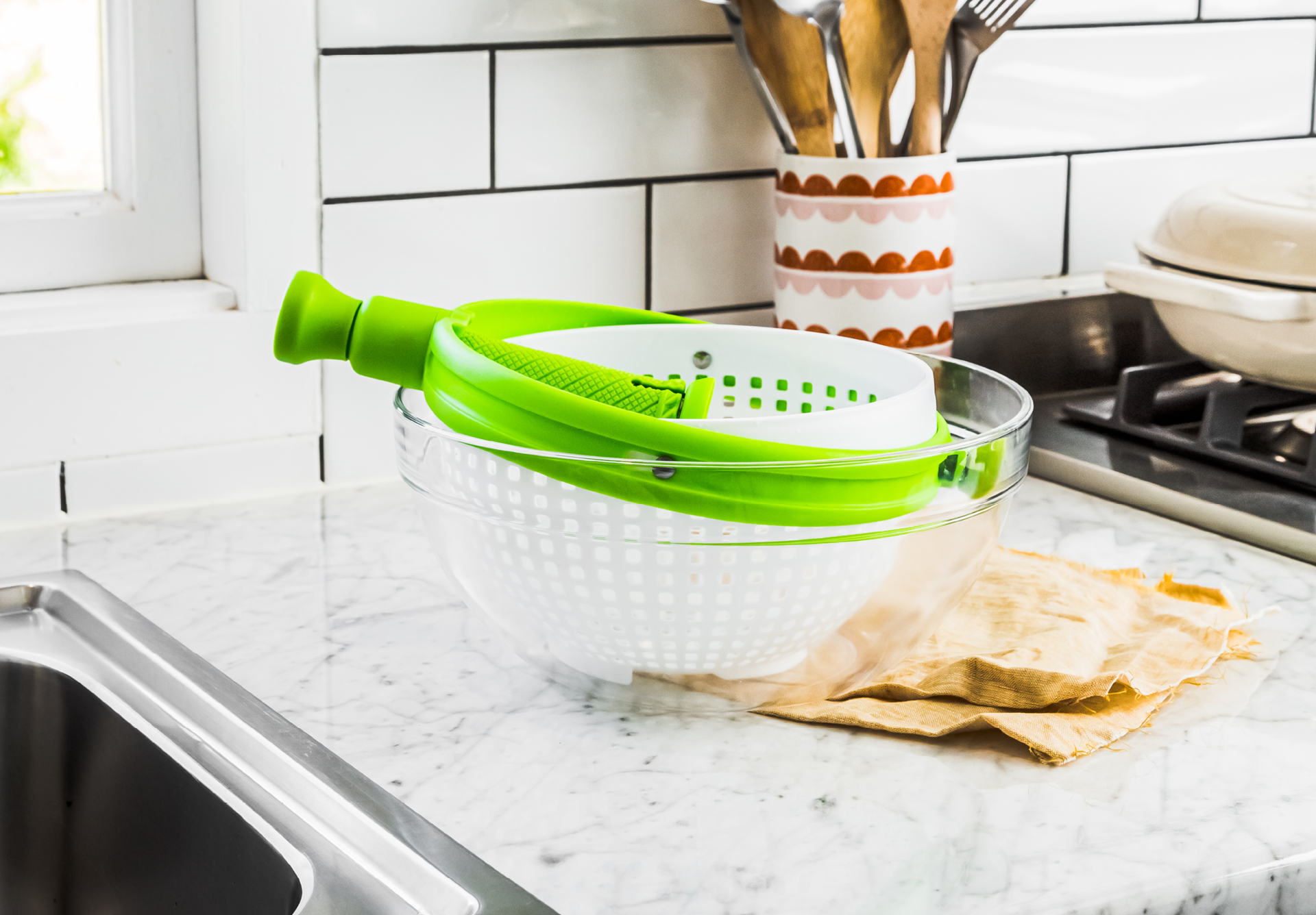 Spina is a straining colander that turns into an in-sink salad spinner.
